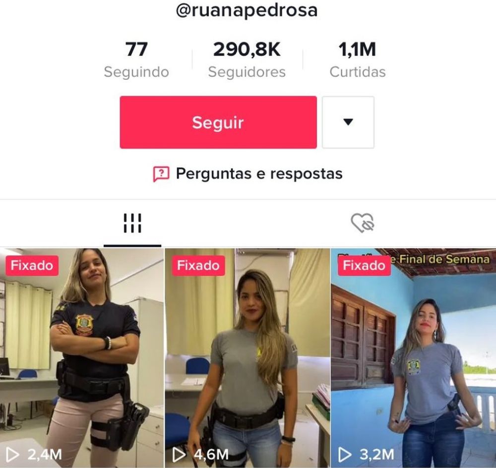 Uma agente da Polícia Civil de Pernambuco foi punida pela Secretaria de Defesa Social (SDS) por causa de vídeos publicados no perfil dela no TikTok. Com mais de 290 mil seguidores na rede social, Ruana Pedrosa Andrade divulgou imagens com a farda da corporação e utilizando distintivo e armas. As imagens somam milhões de visualizações. Veja fotos abaixo.