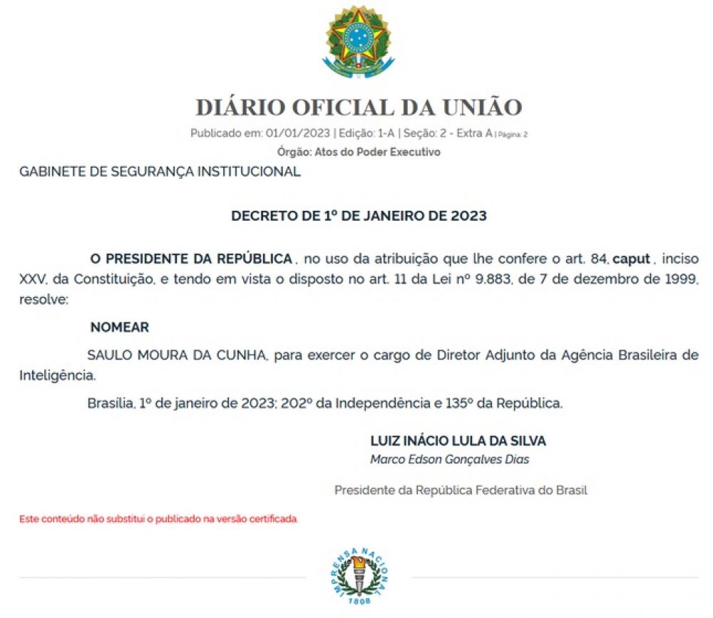 O oficial de Inteligência Saulo Moura da Cunha foi nomeado diretor adjunto da Agência Brasileira de Inteligência (ABIN) em publicação no Diário Oficial da União (DOU) deste domingo – 1º de janeiro de 2023.