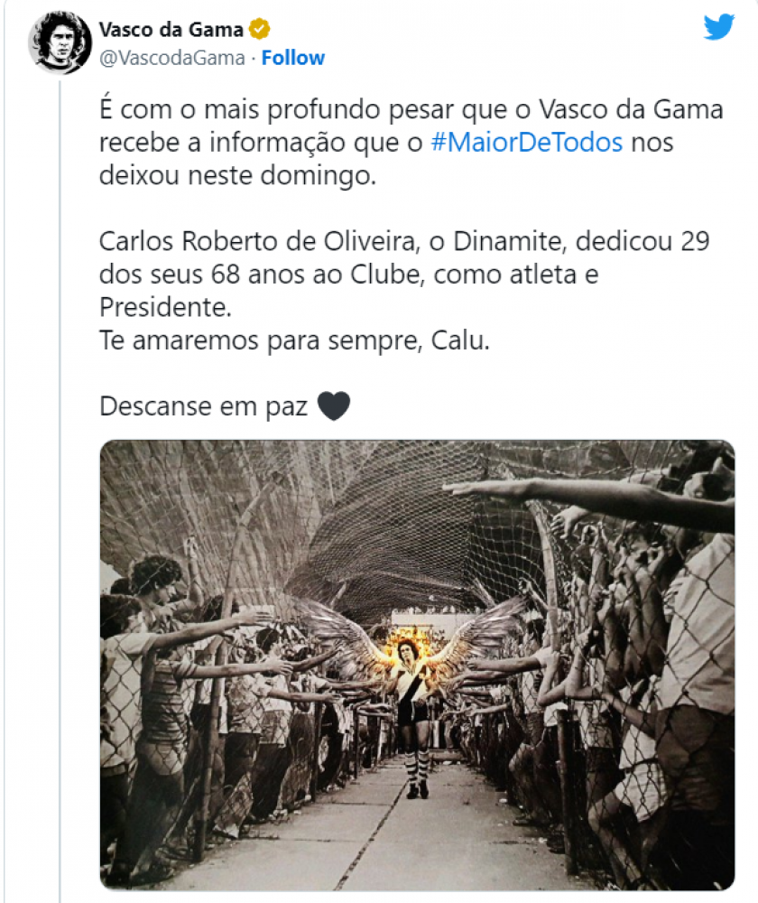 "É com o mais profundo pesar que o Vasco da Gama recebe a informação que o #MaiorDeTodos nos deixou neste domingo. Carlos Roberto de Oliveira, o Dinamite, dedicou 29 dos seus 68 anos ao Clube, como atleta e Presidente. Te amaremos para sempre, Calu. Descanse em paz", disse a postagem do clube.