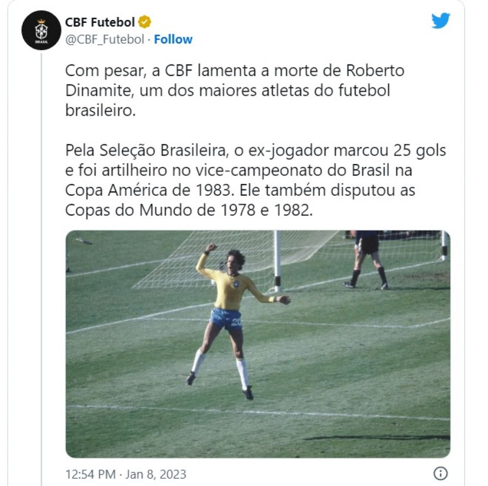 "Com pesar, a CBF lamenta a morte de Roberto Dinamite, um dos maiores atletas do futebol brasileiro. Pela Seleção Brasileira, o ex-jogador marcou 25 gols e foi artilheiro no vice-campeonato do Brasil na Copa América de 1983. Ele também disputou as Copas do Mundo de 1978 e 1982", afirmou a confederação em nota.