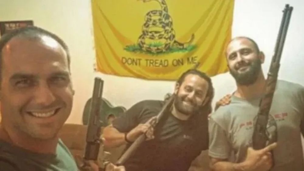 O deputado federal Eduardo Bolsonaro (Republicanos), postou uma foto em que segura uma arma e a bandeira de fundo em 2017. — Foto: Reprodução/Redes Sociais