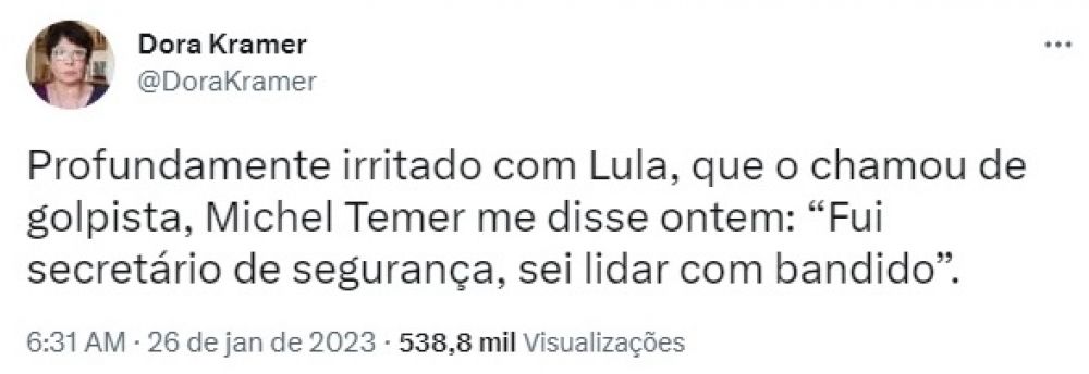 A jornalista Dora Kramer, comentarista de política da BandNews FM, usou suas redes sociais, nesta quinta-feira (26), para contar um inusitado desabafo que o ex-presidente Michel Temer (MDB) teria feito a ela.