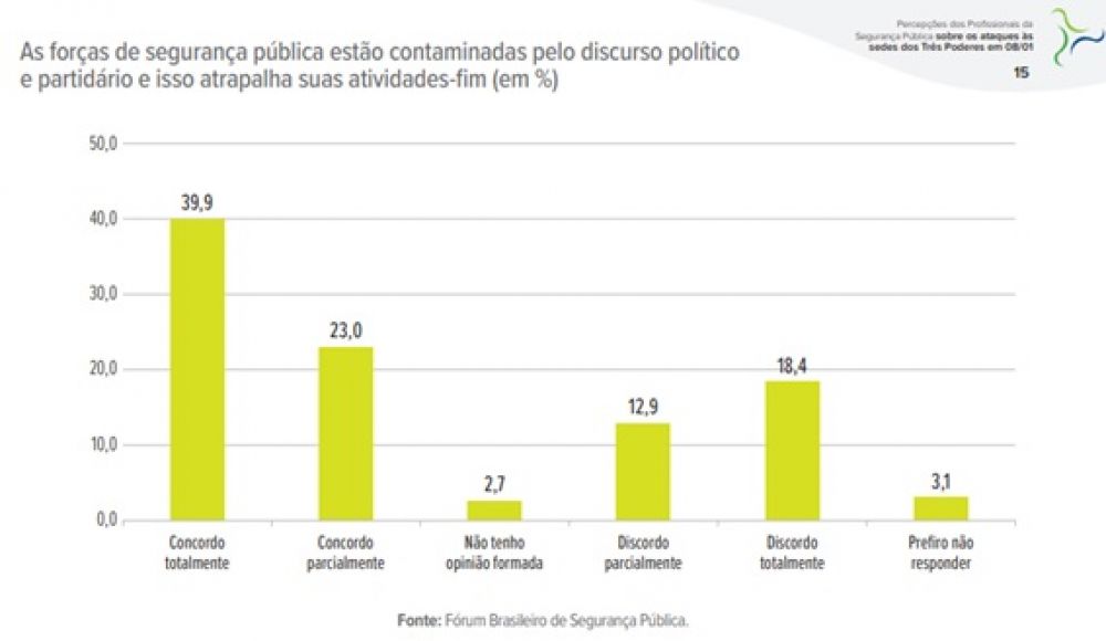 O levantamento é coerente com resultados de pesquisas, com diferentes metodologias, que o Fórum Brasileiro de Segurança Pública tem realizado desde 2020 e que indicam que, a despeito dos resultados globais dos estudos indicarem adesão majoritária dos profissionais da segurança pública à democracia, entre 15% e 40% dos respondentes podem ser considerados radicalizados ou potencialmente radicalizáveis, a depender das características da conjuntura política e institucional.