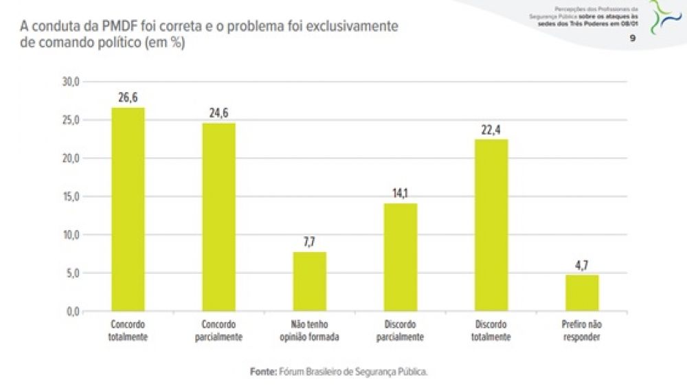 A sondagem mostrou que 75,7% dos profissionais ouvidos concordaram total ou parcialmente que houve falha de planejamento do policiamento da Praça dos Três Poderes no dia 8/01. Outros 51,2% dos entrevistados afirmaram que a conduta da PMDF foi correta e o problema foi exclusivamente do comando político.