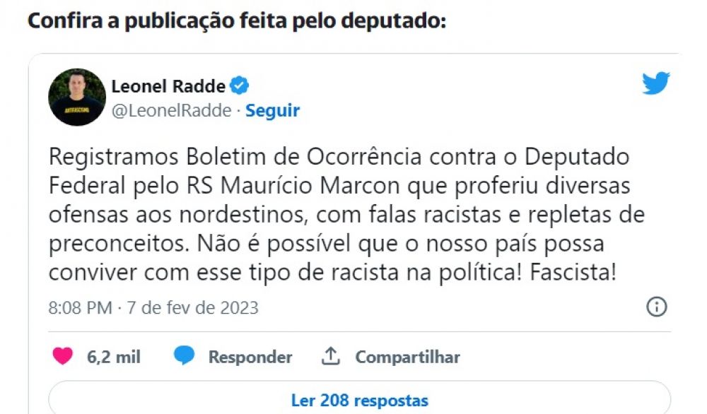 O deputado estadual do Rio Grande do Sul, Leonel Radde (PT) disse ter registrado um boletim de ocorrência contra Marcon após falas "racistas e repletas de preconceito".