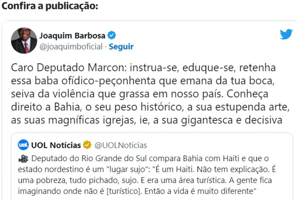 "Caro deputado Marcon: instrua-se, eduque-se, retenha essa baba ofídico-peçonhenta que emana da tua boca, seiva da violência que grassa em nosso país. Conheça direito a Bahia, o seu peso histórico, a sua estupenda arte, as suas magníficas igrejas e a sua contribuição para a formação da nacionalidade brasileira'', escreveu Barbosa.