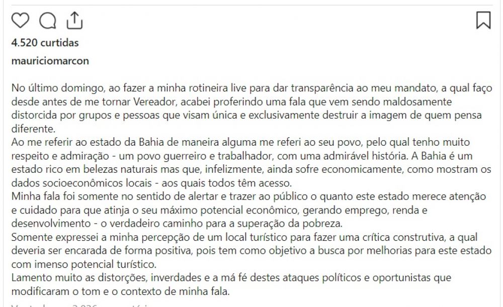 Em uma live no Instagram, o deputado federal Maurício Marcon disse que a “interferência política desastrosa de governos populistas prejudicou o desenvolvimento da Bahia”, ao comentar a votação expressiva em Lula (PT) entre o eleitorado nordestino na última disputa presidencial. Na ocasião, ele afirmou ainda que os políticos da região não têm compromisso, porque, ao seu ver, os eleitores do Nordeste “não cobram muito”.