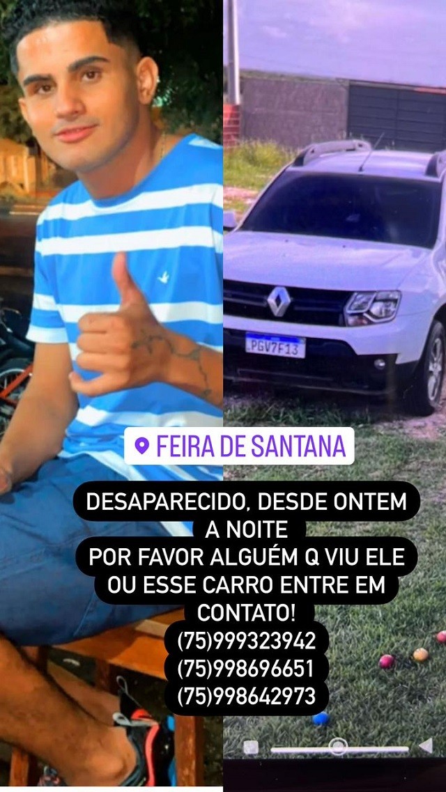 Gabriel Cordeiro de Oliveira, de 24 anos, morador do bairro Papagaio, em Feira de Santana, está desaparecido desde às 20h de terça-feira (7). Ele é vendedor de veículos e até então não entrou ou recebeu contato da família.