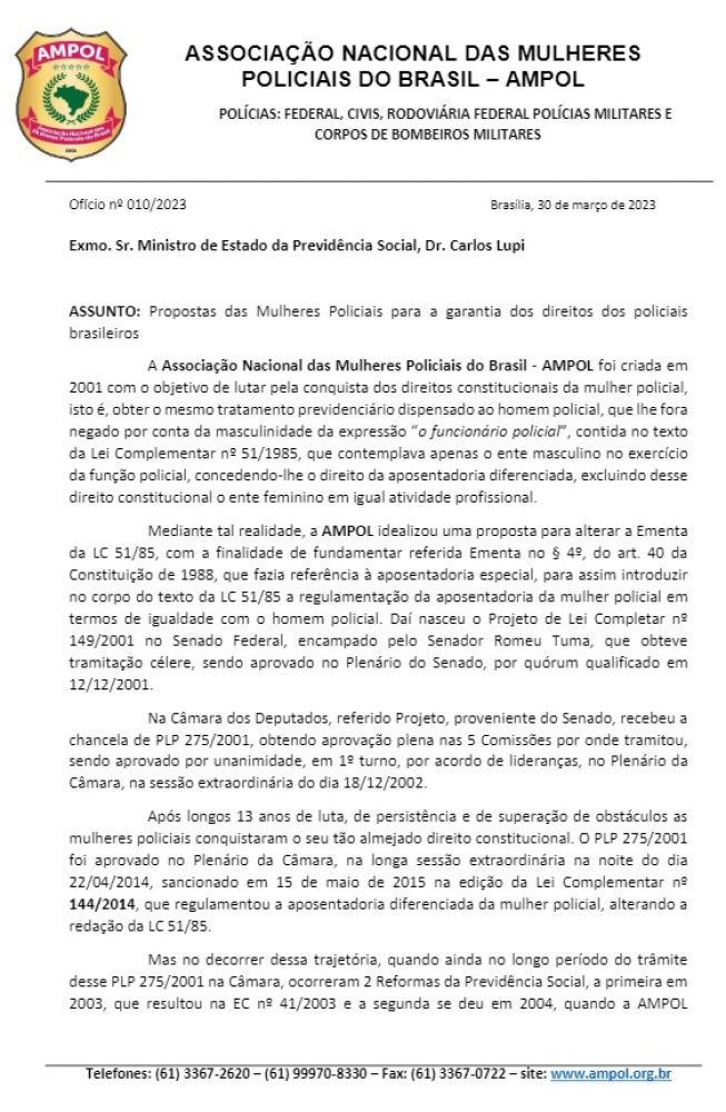 Em importante audiência com o Ministro da Previdência Social, Carlos Lupi, realizada na quinta-feira (30/03), na Esplanada dos Ministérios, a diretoria da ASSOCIAÇÃO NACIONAL DAS MULHERES POLICIAIS (AMPOL) obteve a primeira sinalização de apoio do atual governo na luta histórica da entidade em prol dos direitos das mulheres policiais, sendo que nos últimos anos a batalha tem sido pelo resgate dos direitos e da dignidade profissional das mulheres e dos homens policiais brasileiros, aviltados na Reforma previdenciária (EC 103/2019), promovida no governo anterior.