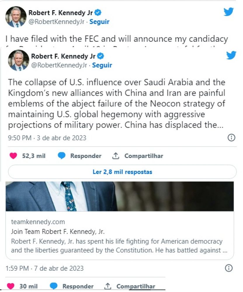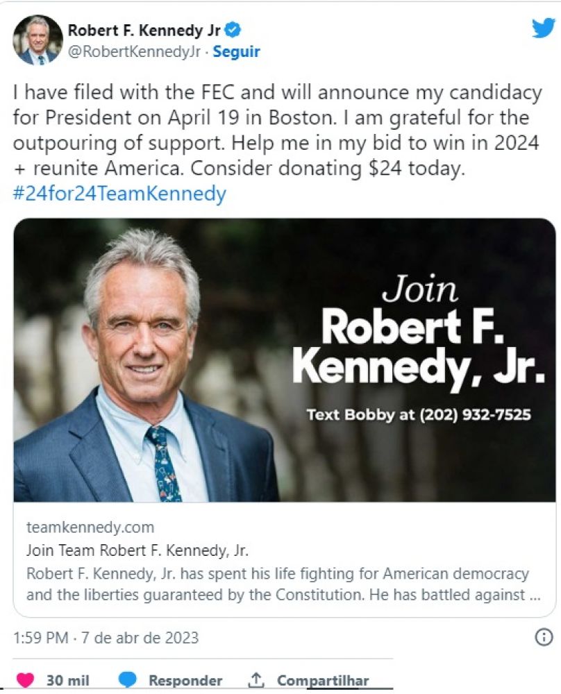 Em março, Kennedy anunciou no Twitter que estava considerando concorrer à presidência com a intenção de acabar com a “fusão corrupta” entre Estado e poder corporativo. Nesta sexta-feira (7), no Twitter, ele pediu contribuições para sua candidatura para ajudá-lo a se eleger e “reunificar a América [Estados Unidos]”.