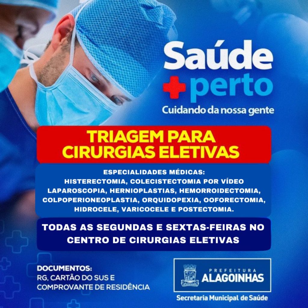A Prefeitura de Alagoinhas, por meio da Secretaria Municipal de Saúde (SESAU) comunica que a triagem de cirurgias eletivas acontece todas as segundas e sextas-feiras no Centro de Cirurgias Eletivas, ao lado da Maternidade, a partir das 07h.