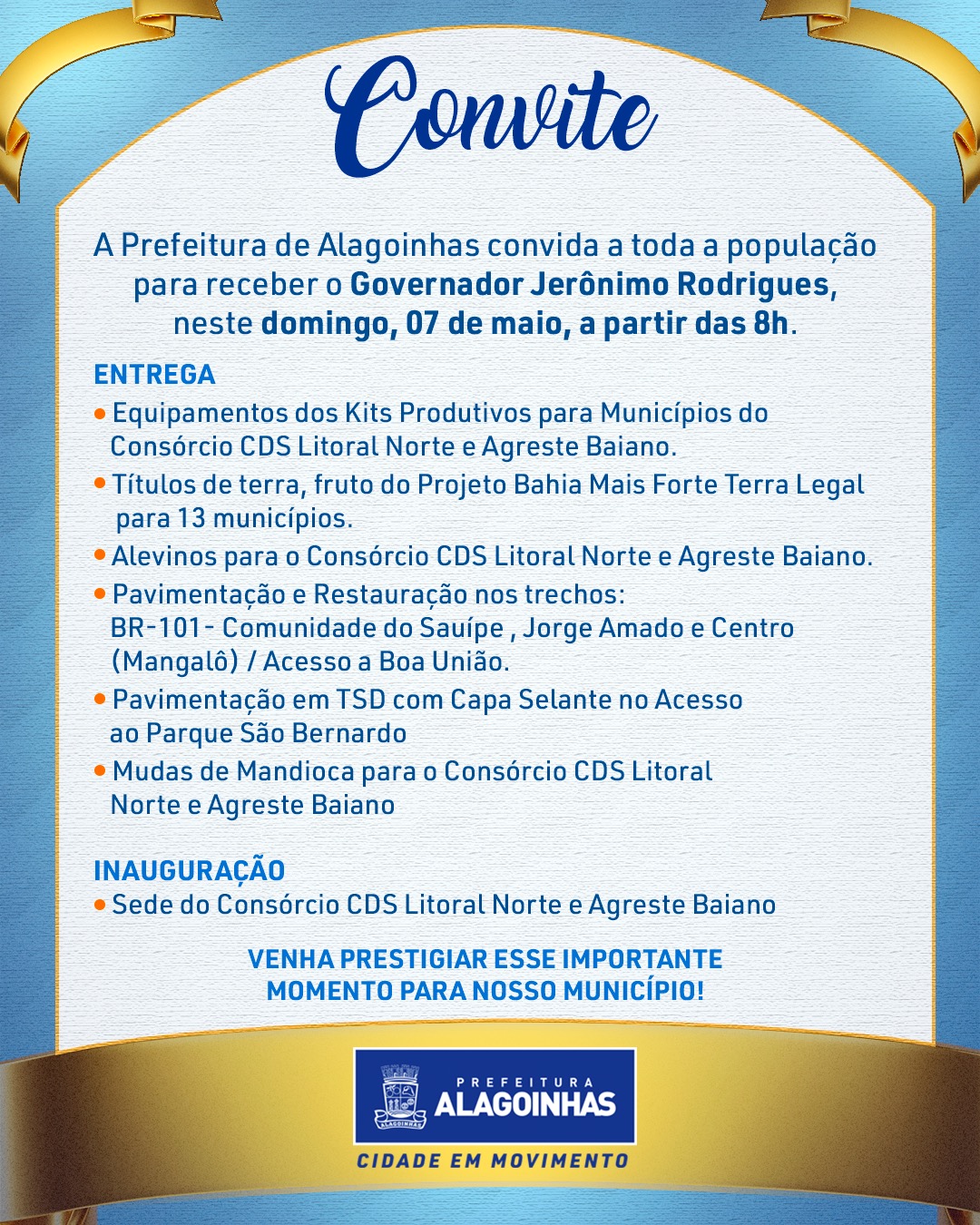 O Governador do Estado da Bahia Jerônimo Rodrigues estará em Alagoinhas, neste domingo (07), para a inauguração da sede do Consórcio CDS Litoral Norte e Agreste Baiano, a partir das 8h da manhã, na BR-101, KM-100, Distrito Industrial de Sauípe (Próximo ao posto da Polícia Rodoviária Federal).