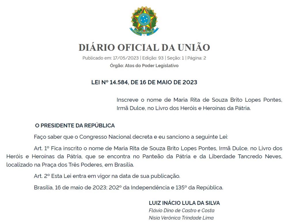 O nome da religiosa baiana Maria Rita de Souza Brito Lopes Pontes, nome de batismo de irmã Dulce, foi incluído no Livro dos Heróis e Heroínas da Pátria, que fica no Panteão da Pátria e da Liberdade, em Brasília. A Lei nº 14.584, de 16.05. 2023 foi sancionada pelo Presidente Luiz Inácio Lula da Silva e publicada na quarta-feira (17) no Diário Oficial da União.