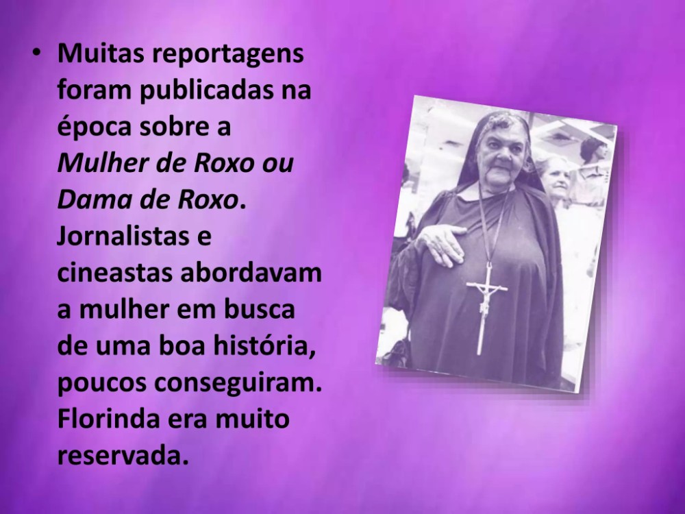Muitas reportagens foram publicadas na época sobre a mulher de roxo ou dama de roxo. O jornalista Marecos Navarro gravou uma entrevista exclusiva com ela e é um dos raros documentos em que é possível ouvir a voz de Florinda. Em 1985 o cineasta baiano Robinson Roberto documentou um vídeo em Super 8 em que a mulher de roxo diz morar no albergue há três anos, e revela pertencer à família Rainha Princesa. Foi também personagem retratado na Galeota Gratidão do Povo, painel de 160 metros quadrados pintado por Carlos Bastos, que decora o plenário da Assembleia Legislativa.