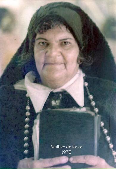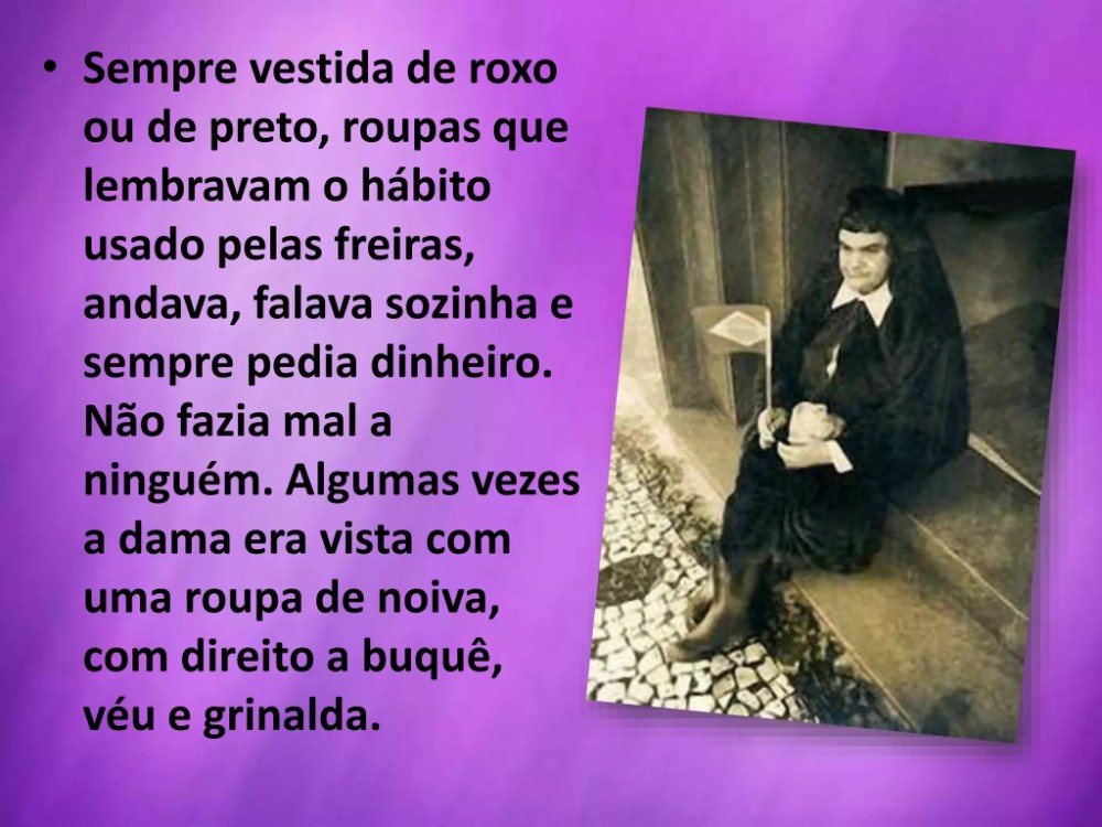 Andava descalça com longas mantas, um torço e um enorme crucifixo. Tudo isso dava a ela um ar meio santo, meio louco, meio andarilho e meio mendigo. Algumas vezes a dama desfilou com uma roupa de noiva, com direito a buquê, véu e grinalda. Com todos esses componentes cênicos, contraditórios e demasiadamente humanos, a mulher de roxo despertou sentimentos em toda a cidade, medo e respeito, pena e carinho.