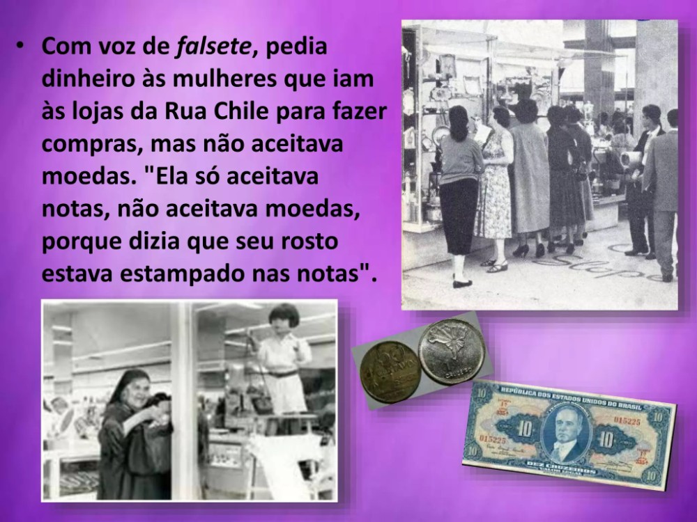 "Entenda-se: cédula! Moeda, ela não aceitava. Queria somente cédula, pois dizia que seu rosto estava estampado nas cédulas a pedido de uma importante pessoa de sua vida", explica Patrícia, sem dar "spoiler" de 'quem teria sido tal figura'.