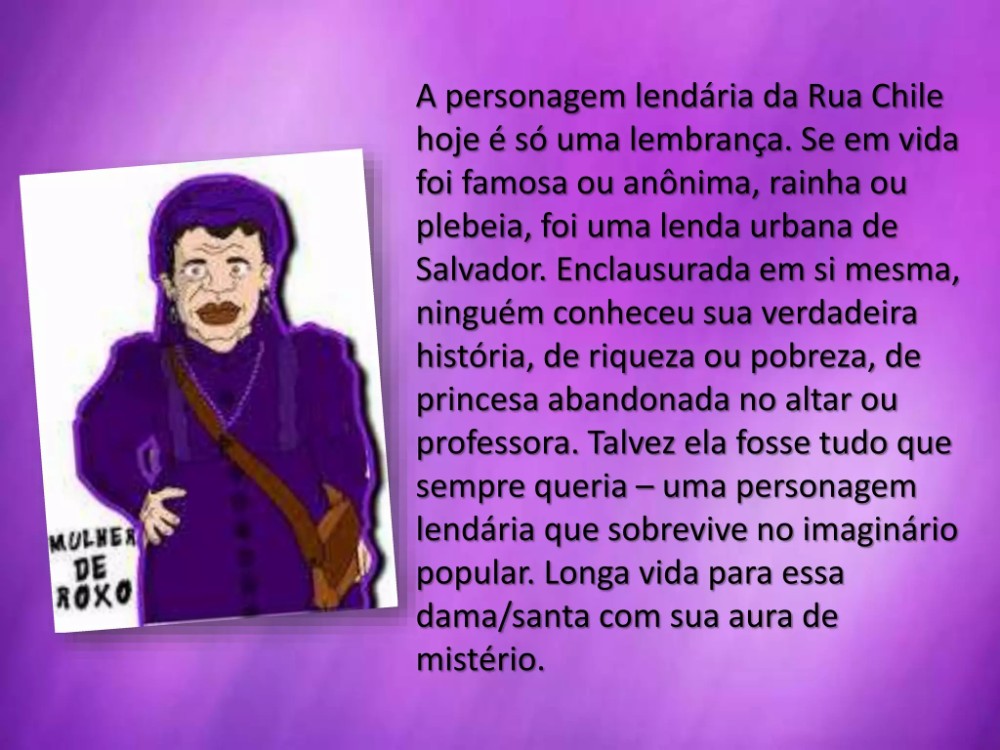 Sempre com um vestido roxo e um enorme crucifixo pendurado no pescoço, uma figura inusitada despertava curiosidade por onde passava. Ela não é um personagem de um filme de terror, tampouco de outra produção. Estamos falando da "Mulher de Roxo" – figura caricata em Salvador por um motivo: sua possível desilusão amorosa.