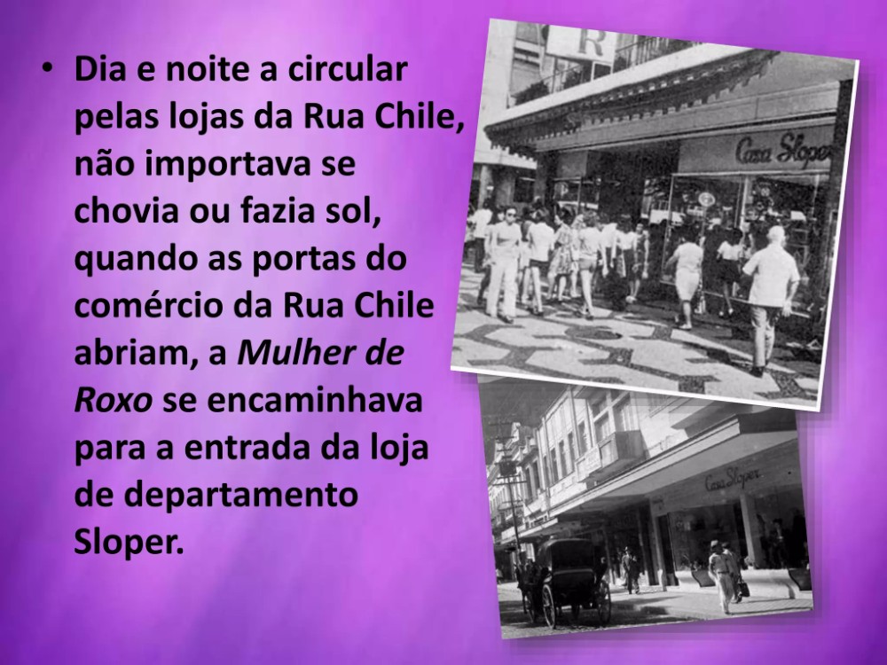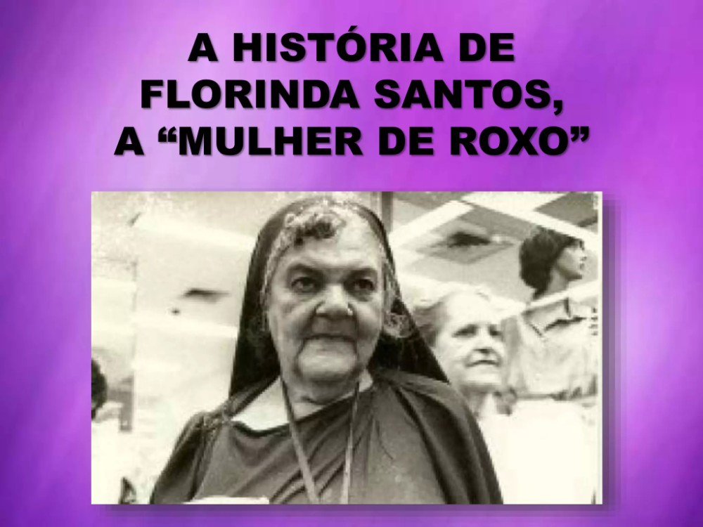 A história de Florinda Santos, a conhecida Mulher de Roxo, se transformou numa lenda urbana, uma figura mitológica conhecida por todos da localidade. Não importava se o dia era de chuva ou de sol, ela nunca faltava. Era só as portas do comércio da Rua Chile abrirem e dona Florinda já se encaminhava para a entrada da Slopper. Vestido com roupa de veludo violáceo, iniciava o ritual diário. Andava de um lado para o outro, falava sozinha e sempre pedia dinheiro. Tudo com muita educação. Afinal, dizia-se que a Mulher de Roxo, personagem dos tempos diários do centro da cidade, vinha de boa família.