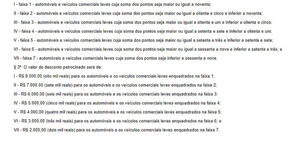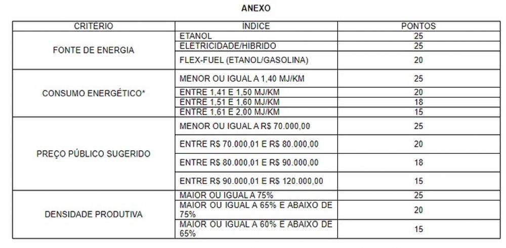 Os critérios para os descontos nos veículos leves foram incluídos em anexo à MP, elencando quais pontos serão concedidos para cada tipo de regra estabelecida pelo governo, como fonte energética, eficiência, preço público e densidade produtiva.