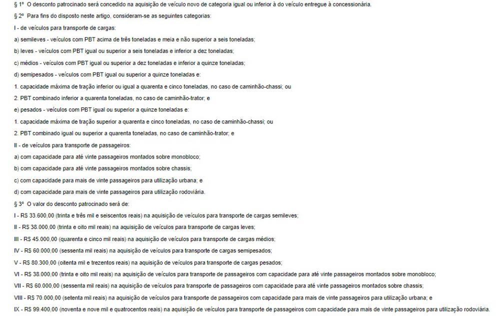 No caso dos pesados o menor desconto será concedido aos caminhões semileves, R$ 33,6 mil, e o maior aos ônibus rodoviários com capacidade para mais de vinte passageiros, R$ 99,4 mil.