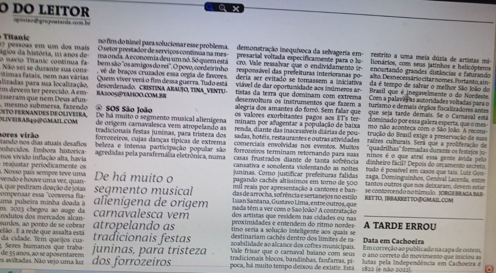 (*) Publicado no Jornal A Tarde, (Espaço do Leitor), edição de 24.06.2023.