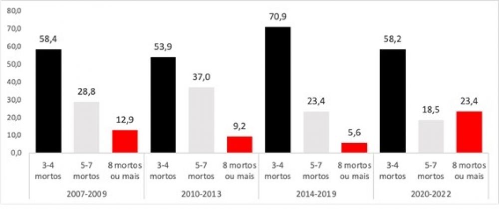 Como é possível observar, o período de 2020-2022 é aquele no qual a porcentagem de megachacinas policiais é a mais elevada, chegando a 23,4% do total. Em períodos anteriores, a participação das megachacinas no total de chacinas policiais alcançara no máximo 12,9% no período de 2007-2009 e, entre 2014 e 2019, chegara a ser quase cinco vezes menor do que entre 2020-2022, o que apontaria uma concentração de megachacinas entre 2020-2022.