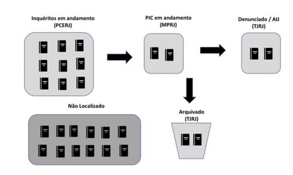 Por fim, dentre as 27 megachacinas analisadas, pudemos observar um padrão de impunidade semelhante ao processamento legal dos casos ordinários de letalidade policial, descritos em estudos como o de Misse et al. [2], Zaccone[2], Araújo[4], Farias[5] e, mais recentemente, do Fórum Justiça [6]. Mesmo com toda a visibilidade pública que estes eventos adquirem a análise do fluxo de processamento dos casos, cujos resultados podem ser observados abaixo (Gráfico 3), é absolutamente clara a falta de responsabilização nesses casos.