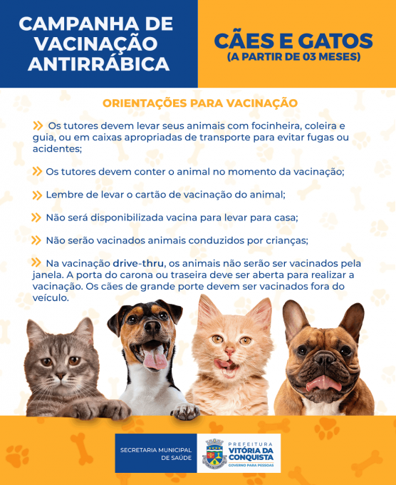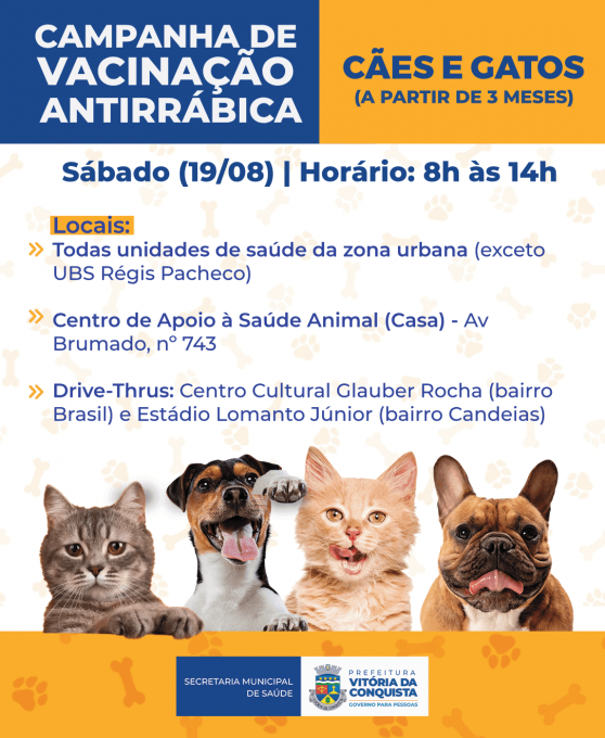 Neste sábado (19), das 8h às 14h, terá vacinação antirrábica para cães e gatos a partir de três meses de idade. O imunizante estará disponível em todas as unidades de saúde da zona urbana, exceto Régis Pacheco, e também no Centro de Apoio à Saúde Animal (Casa), na Av. Brumado. Além disso, também terá drive-thrus no Centro Cultural Glauber Rocha, no bairro Brasil, Estádio Lomanto Júnior, Av. Luiz Eduardo Magalhães.