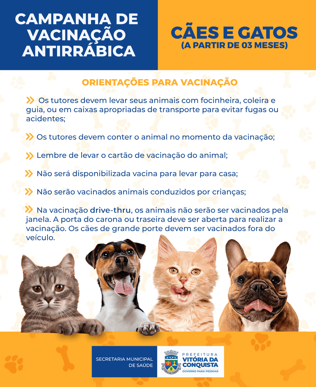 A Secretaria Municipal de Saúde (SMS) orienta os tutores a levarem o animal com coleira, guias ou em caixas adequadas, para evitar fugas ou acidentes. Se optar pela vacinação no drive-thru, os animais pequenos não devem descer do carro, pois estes serão vacinados pela porta dianteira ou traseira do carro, aberta, mantendo as janelas fechadas para evitar que o animal fuja. Já os animais de grande porte devem ser vacinados fora do veículo.