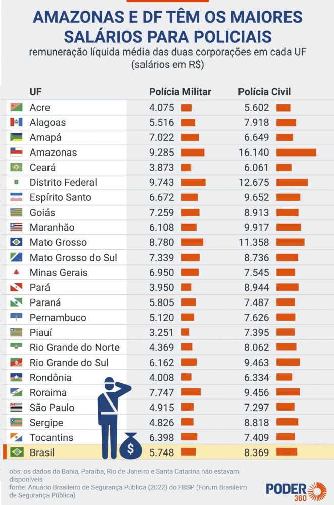 Segundo dados do Anuário Brasileiro de Segurança Pública de 2022, os policiais militares do DF têm o maior salário médio do país. Recebem R$ 9.743. Já o Estado do Amazonas tem a maior remuneração líquida média para funcionários da Polícia Civil: R$ 16.140.