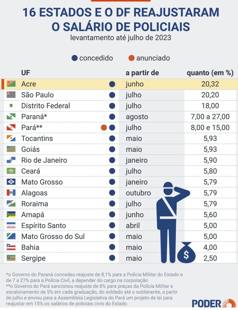 Levantamento do Poder360 mostra que 16 Estados e o DF (Distrito Federal) concederam reajuste salarial para policiais militares e civis em 2023. Os percentuais de aumento na remuneração dos funcionários variam de 2,5% a 20,32%.