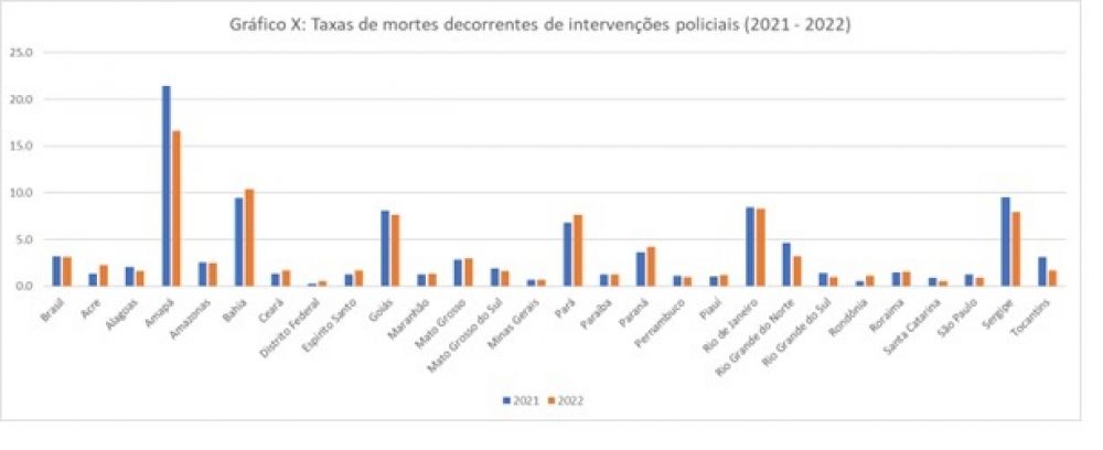 Amapá segue tendo a mais alta taxa de letalidade policial do Brasil, seguido por Bahia, Rio de Janeiro, Sergipe, Pará e Goiás. Em contrapartida, Pernambuco, Rio Grande do Sul, Rondônia e Piauí têm taxas menores que 2 mortes causadas pela polícia para cada 100 mil habitantes.
