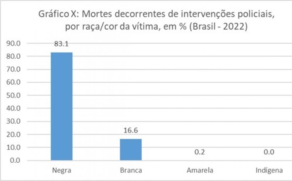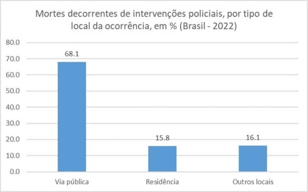 Os dados que permitem construir o perfil das vítimas da letalidade policial mantém sua faceta evidente e consolidada historicamente do racismo que estrutura a sociedade brasileira. 83% dos mortos pela polícia em 2022 no Brasil eram negros, 76% tinham entre 12 e 29 anos. Jovens negros, majoritariamente pobres e residentes das periferias seguem sendo alvo preferencial da letalidade policial e, em resposta a sua vulnerabilidade, diversos estados seguem investindo no legado de modelos de policiamento que os tornam menos seguros e capazes de acessar os direitos civis fundamentais à não-discriminação e à vida. O dado sobre local de ocorrência revela a prevalência (68,1%) dos espaços públicos como de maior frequência das ocorrências de MDIP, ao passo que, residências das vítimas e outros tipos de local somam juntos um terço das ocorrências, ou seja, ⅙ das vítimas de letalidade policial foi morta dentro de casa.