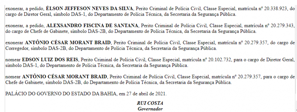 No rol das mudanças implementadas pelo governador Rui Costa, o ex-corregedor do DPT Antônio César Morant Braid, assume o cargo de Chefe de Gabinete no lugar de Alexsandro Fiscina de Santana.