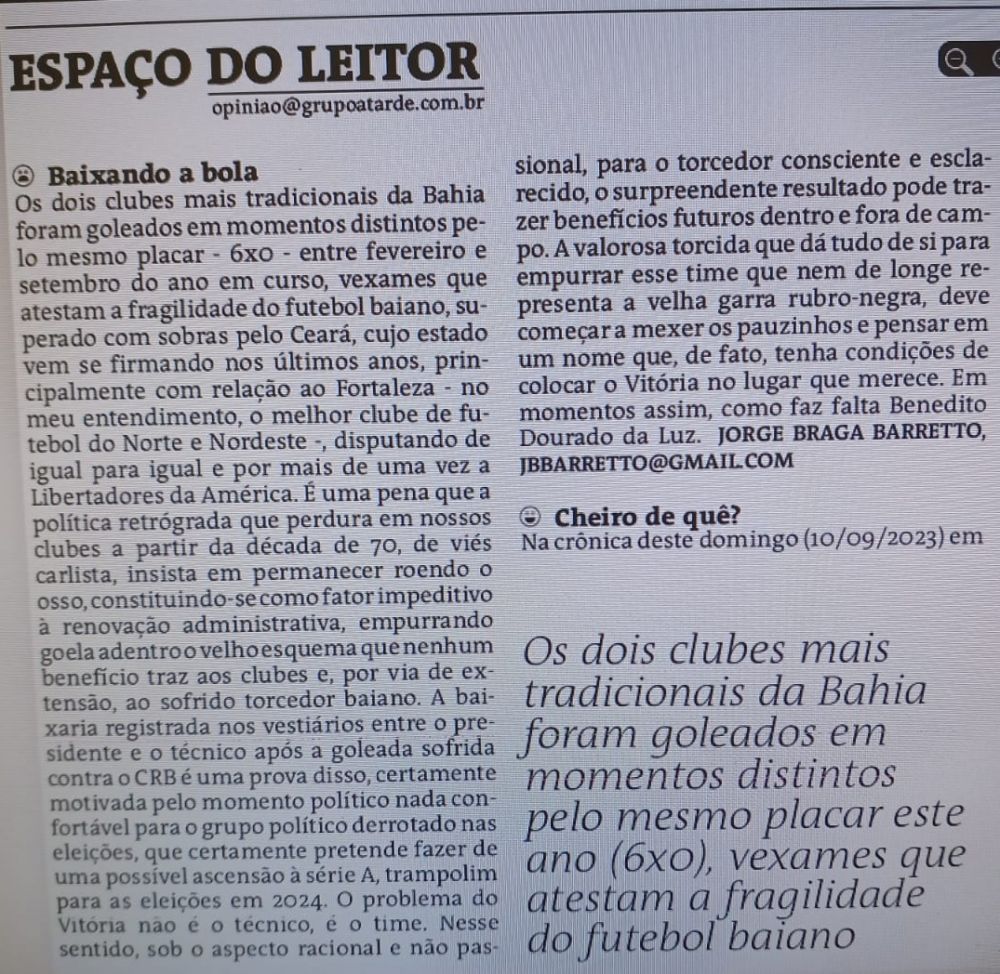 (*) Publicado no Jornal A Tarde, (Espaço do Leitor), edição de 12.09.2023.