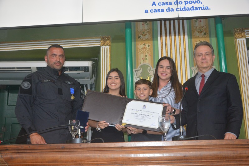 Ocorreu, na sexta-feira, dia 01/9, no Plenário Cosme de Farias, uma sessão solene para a entrega da Medalha Thomé de Souza ao policial Douglas Lima Pithon. A proposição é de autoria do Presidente da Câmara Municipal de Salvador, Carlos Muniz (PSDB), e a sessão foi presidida pelo Vereador Maurício Trindade (PP).