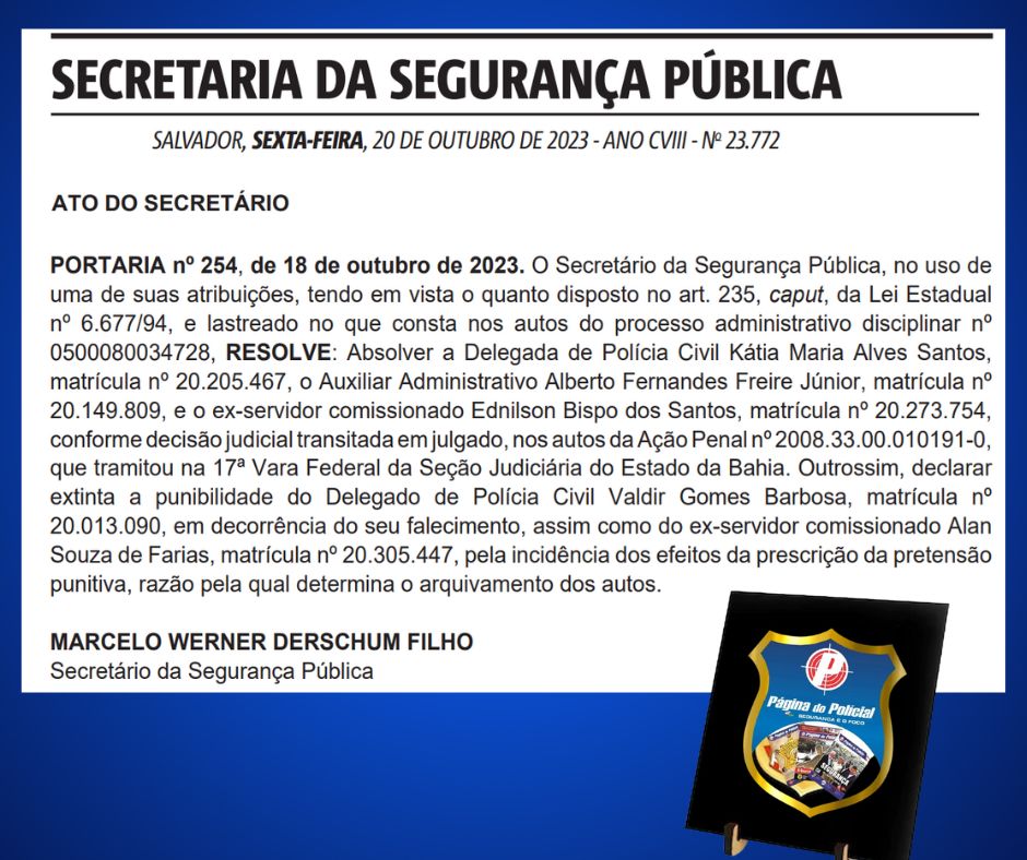 A portaria que trouxe o arquivamento do processo administrativo foi assinada pelo Secretário de Segurança Marcelo Werner e publicada no Diário Oficial do Estado (DOE) da sexta-feira (20).