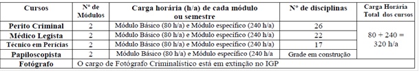 Mesmo sendo uma escola recentemente criada, há uma preocupação do IGP/RS em atualizar todos os seus cursos e que, mesmo os profissionais ingressando nos seus quadros para exercerem as funções na sua formação acadêmica, como no caso dos médicos legistas e peritos há um módulo básico igual para todos os cursos visando uma uniformidade no processo formativo de seus integrantes, conforme Tabela 5.