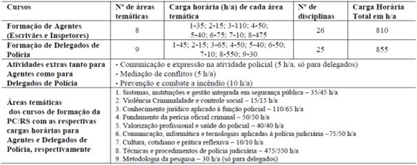 Pela análise da Tabela 3 percebe-se que os cursos, de delegado e agente, são muito similares tanto nas áreas temáticas quanto nas disciplinas e suas respectivas cargas horárias, sendo que as áreas temáticas que norteiam a malha curricular dos cursos de formação da PC/RS estão alinhadas com as oito áreas temáticas propostas pela MCN.