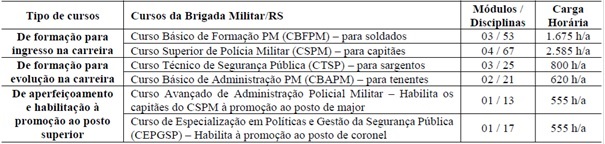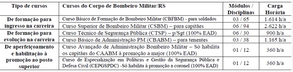Atualmente a BM/RS possui quatro cursos regulares de formação e dois de habilitação à promoção, conforme Tabela 1: