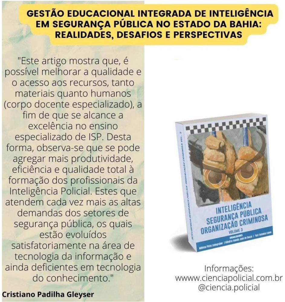 "Este artigo mostra que, é possível melhorar a qualidade e o acesso aos recursos, tanto materiais quanto humanos (corpo docente especializado), a fim de que se alcance a excelência no ensino especializado de ISP. Desta forma, observa-se que se pode agregar mais produtividade, eficiência e qualidade total à formação dos profissionais da Inteligência Policial. Estes que atendem cada vez mais as altas demandas dos setores de segurança pública, os quais estão evoluídos satisfatoriamente na área de tecnologia da informação e ainda deficientes em tecnologia do conhecimento." Cristiano Padilha Gleyser