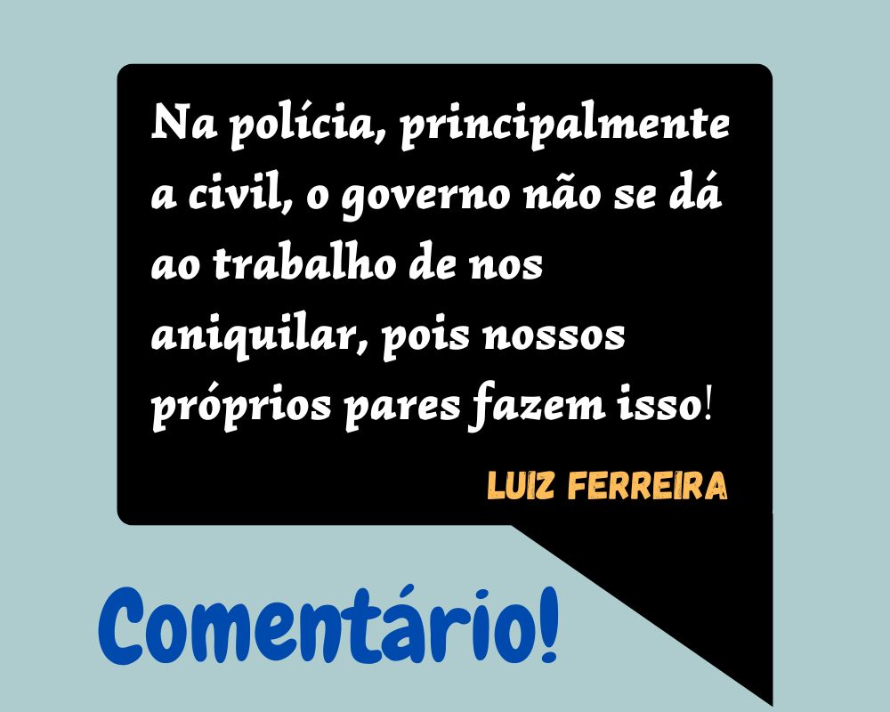 Veja em outras categorias, saúde, educação, fazenda, etc, todos se unem em pró da classe, mas na polícia, principalmente a civil, o governo não se dá ao trabalho de nos aniquilar, pois nossos próprios pares fazem isso. E fazem por migalhas de um cargo, de um salário diferenciado, se vendem, Judas o iscariotes é criança diante de alguns desgraçados (as), que pensam apenas em si, mas esquecem que um dia a morte vai destruir toda as suas traições, as suas arrogâncias, prepotências.