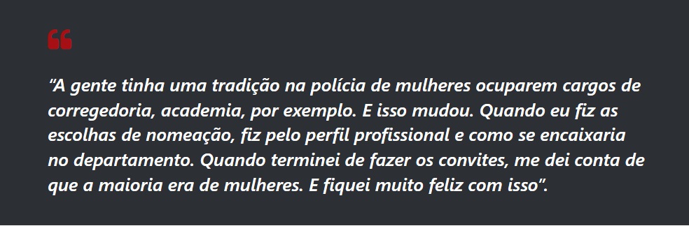 O convite para ser a delegada-geral veio no final de 2020. Para assumir o cargo, Heloísa lançou mão de determinação e coragem, pois sabe o tamanho da responsabilidade que carrega tanto como policial quanto como mulher.