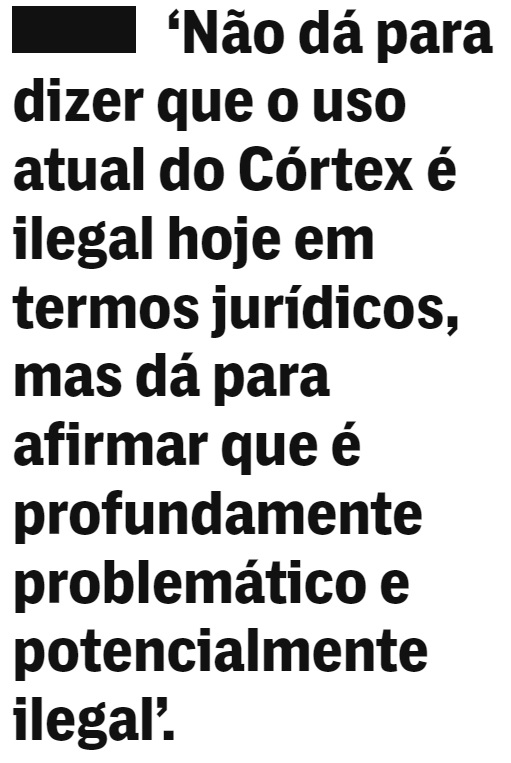 “Não dá para dizer que o uso atual do Córtex é ilegal hoje em termos jurídicos, mas dá para afirmar que é profundamente problemático e potencialmente ilegal”, me disse Rafael Zanatta, advogado e pesquisador do Lavits, a Rede Latino Americana de Estudos sobre Vigilância, Tecnologia e Sociedade. “Eu também não sei, como pesquisador, o que eles fazem. Existe um problema fundamental aí de opacidade. Isso já é um ponto de partida muito problemático”.