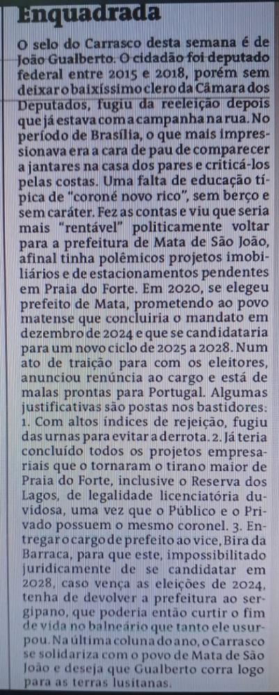 Na última coluna do ano, o Carrasco se solidariza com o povo de Mata de São João e deseja que Gualberto corra logo para as terras lusitanas.