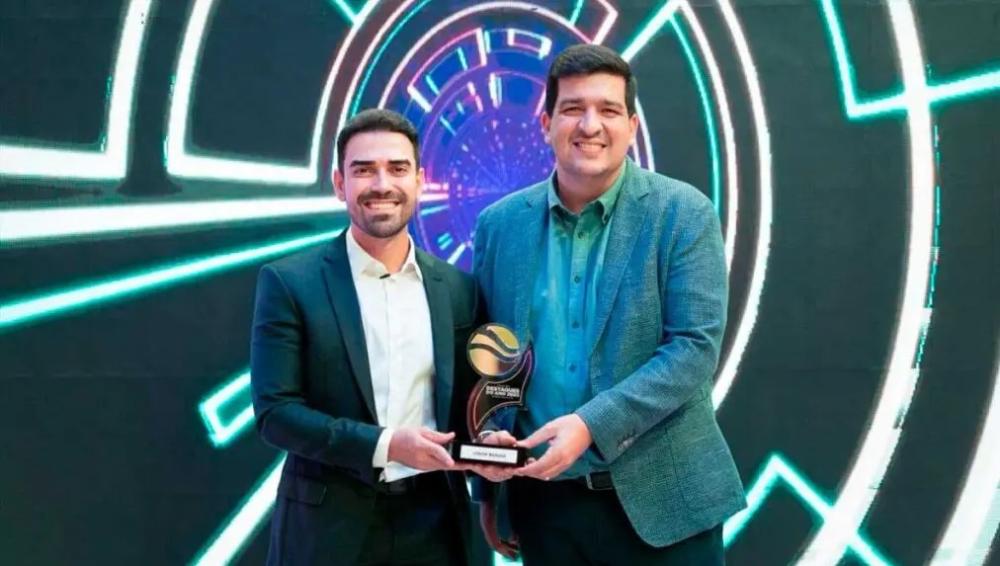 Prefeito Junior Marabá recebe o Troféu Destaques do Ano 2023 na cerimônia da Rede Caraíbas de Comunicação, simbolizando a forte conexão entre Luís Eduardo Magalhães e a região de Irecê.