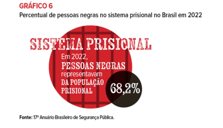 As marcas do racismo aparecem, ainda, na dinâmica da Justiça Criminal e do Sistema Prisional. Em 2022, a população carcerária do Brasil superou a marca de 832 mil pessoas. No recorte racial, a proporção de pessoas negras encarceradas alcançou 68,2% desse total. Estamos, portanto, frente a um sistema que pune e penaliza, prioritariamente, a população negra. Como já tratamos aqui, as abordagens policiais privilegiam o enquadramento de jovens negros periféricos como criminosos em potencial e são tomadas como peça-chave do modelo de policiamento e segurança pública no país. Ao não determinar critérios objetivos de distinção entre usuário e traficante, a Lei de Drogas reserva aos policiais na ponta o poder de construir a maior parte da clientela do sistema prisional a partir dos vieses racistas e preconceitos com que conduzem suas abordagens [5]. O avanço da suposta guerra às drogas sob a forma da Lei de Drogas construiu um cenário em que se promove, simultaneamente, o encarceramento em massa e a vulnerabilização de jovens negros presos por crimes não-violentos, e o espraiamento das facções de origem prisional, que instrumentalizam as condições absolutamente degradantes e letais de vida [6] nos presídios para recrutá-los.