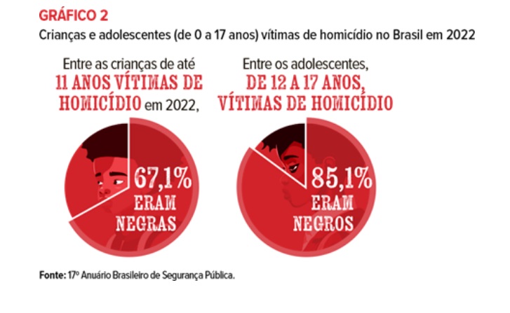 As novas gerações negras são também vítimas preferenciais das mortes violentas. Segundo dados do 17º Anuário Brasileiro de Segurança Pública, dentre as crianças de até 11 anos vítimas de homicídio, 67,1% eram negras. Entre os adolescentes de 12 a 17 vítimas de homicídio, 85,1% eram negros. A violência letal tem cor e endereço certos no Brasil e acomete de modo majoritário e extremamente desproporcional jovens negros pobres e periféricos.