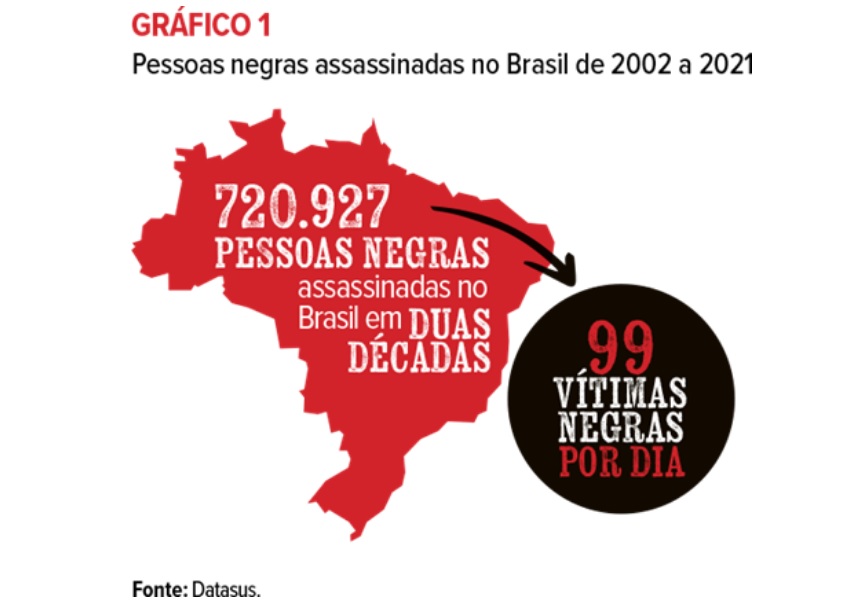 Conforme dados do Datasus, entre 2002 e 2021, 720.927 pessoas negras foram assassinadas no Brasil. 99 negros por dia. Ao longo de 20 anos. Negros representam 71% de todas as vítimas de assassinato no Brasil no período. Somente em 2021, 36.922 pessoas negras foram mortas.