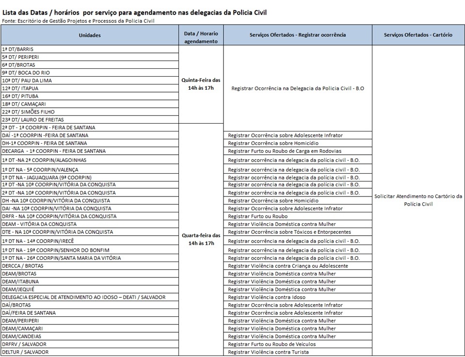 Entre as unidades estão Delegacias Territoriais situadas na capital, na Região Metropolitana de Salvador (RMS) e em cidades do interior do Estado. Também vão oferecer serviços agendados 19 Delegacias Especializadas, situadas na capital e no interior. Confira na tabela abaixo as delegacias da Polícia Civil que vão oferecer o atendimento com hora marcada e os serviços disponíveis.